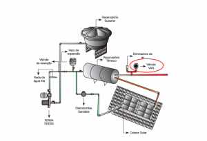 Este sistema é composto por dois elementos – os coletores solares (as placas de captação) e o reservatório de água quente chamado de boiler. O equipamento utiliza a energia solar para o aquecimento de água para o banho, que circula por gravidade entre os coletores sendo armazenada no reservatório térmico de água quente, ou seja, este funcionamento é natural. A radiação solar atravessa o vidro atingindo a água que está circulando nas serpentinas internas, fazendo com que a água aqueça,após este processo retorna para o reservatório, ficando pronta para o consumo. O reservatório térmico tem a importante e indispensável função de armazenar e isolar a água da perda de calor, mantendo dessa forma a água aquecida por um longo período de tempo. A caixa de água fria alimenta o reservatório térmico (boiler), mantendo-o sempre cheio.